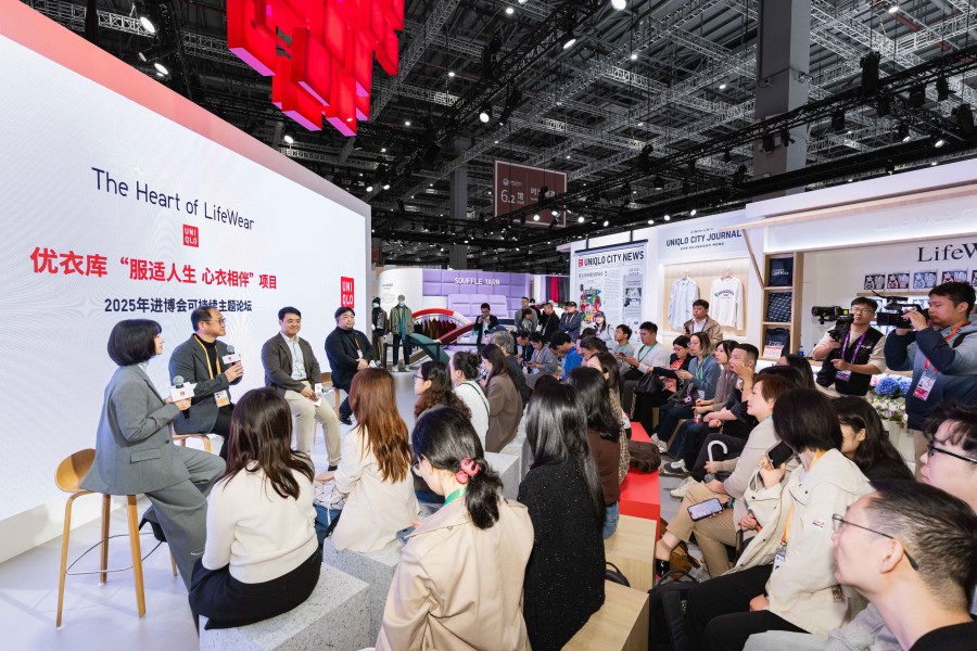 在第八届中国国际进口博览会上,优衣库举办了一场可持续发展论坛。论坛以The Heart of LifeWear「服适人生 心衣相伴」为核心,特邀迅销集团、中国宋庆龄基金会及东丽集团的三位嘉宾代表,跨界共议服装产业如何赋能美好生活,探讨如何通过创新与合作,以服装为媒介传递温暖,践行企业社会责任。