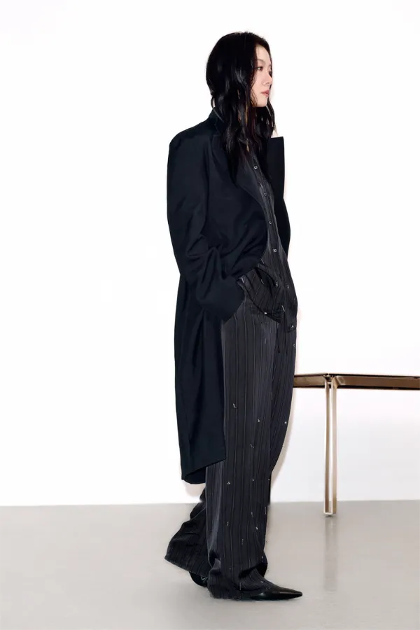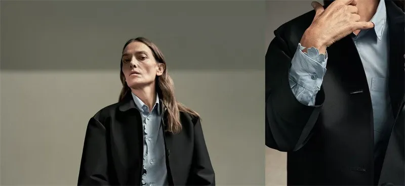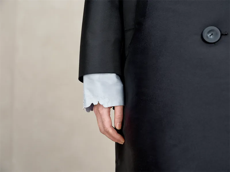 风衣流畅而放松的线条自上而下徐徐展开,不刻意强调曲线,却以精巧的余量容纳不同身形,如同给身体预留的一方私密领地,让每一次举手投足都自带从容的韵律。面料选用羊毛面料中的全毛硬挺精纺平纹呢,不同于传统风衣材料,保持舒适、精致的同时,利用硬挺的材质更好展现设计廓形。