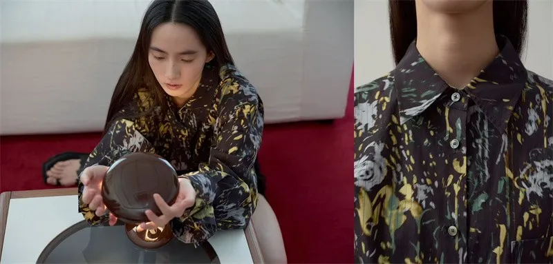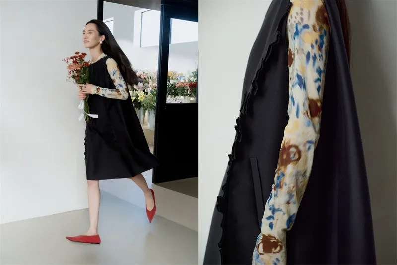 在细节中构筑一幅新春时分动态的“春日花园”。蔷薇、喇叭花、向日葵和绣球花牡丹争相开放,水彩绚丽的花丛在极简的底蕴上轻轻跃动。春日午后,漫步城市中的小众书店或露天咖啡馆,阳光穿透树叶在印花上投下斑驳光影,身上的花园与窗外的真实花丛在“凝视”中和解,仪式感不再只存在于特殊时刻,而是带入日常的每一个瞬间。