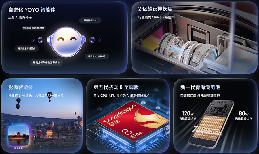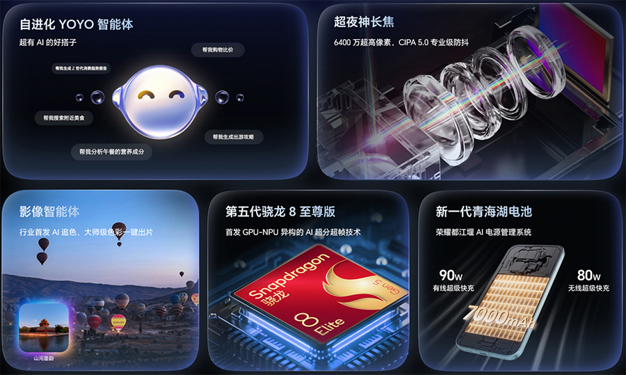 荣耀Magic8 Pro搭载第五代骁龙8至尊版处理器,性能达到该平台最强,安兔兔跑分突破428万历史最高。该机行业首发GPU-NPU异构AI超分超帧技术,支持同时超分、超帧,成为行业首个通过SGS系统动效流畅双优认证的手机。此外,荣耀Magic8 Pro还首发MagicOS 10系统,内置YOYO智能体(L3级认证),支持复杂意图理解、逻辑推理与跨应用任务执行。