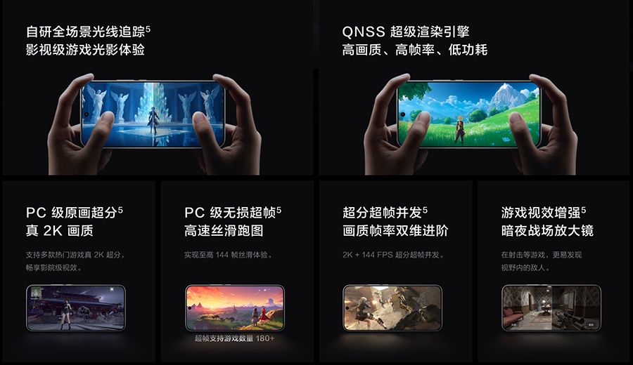 Q3芯片不仅带来了画质上的提升,还通过PC显卡级的AI超级采样技术,实现了超分画面的精细渲染,在行业内具有显著优势。在运行游戏原生画质时,QNSS超级渲染引擎还能有效降低游戏功耗与发热,确保重载游戏下的帧率稳定和流畅体验。