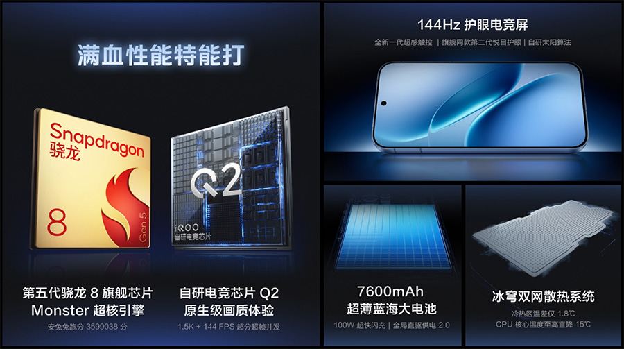 iQOO Z11 Turbo最大的亮点在于其同时搭载了第五代骁龙8旗舰芯片和自研电竞芯片Q2。第五代骁龙8采用台积电3nm工艺,双超大核主频高达3.8GHz,辅以六颗性能大核,主频3.32GHz,使得CPU性能提升了36%,功耗降低了42%;GPU性能也提升了11%,功耗降低了28%。这一组合让iQOO Z11 Turbo的综合性能比肩高端旗舰,安兔兔综合跑分高达359W+,成为同档位性能最强悍的中端机型。