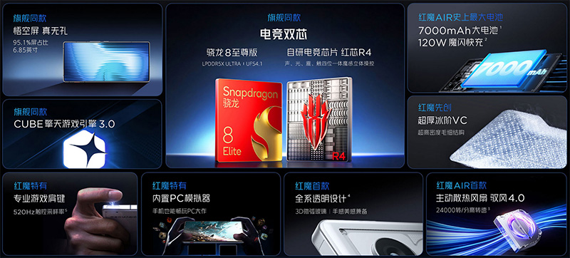 硬件配置方面,红魔11 Air搭载了高通骁龙8至尊版处理器,搭配红芯R4自研电竞芯片,实现了2K 144Hz超分超帧并发,并支持超过200款热门游戏的适配。前置1600万屏下前摄与后置5000万主摄+800万超广角的组合,满足了用户日常自拍和视频通话的需求。此外,红魔11 Air还提供了星尘白、量子黑、极光银等多种配色供消费者选择。