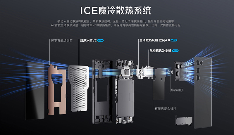 作为唯一内置主动散热风扇的Air手机,红魔11 Air此次升级到了驭风4.0散热系统,实现了每分钟24000转的可持续转速。高低叶差叶片设计有效提升了风量风压,同时在机身内部打造了全新高效散热通路,将核心热量快速导向风扇散出,确保手机在长时间游戏过程中依然保持冷静。