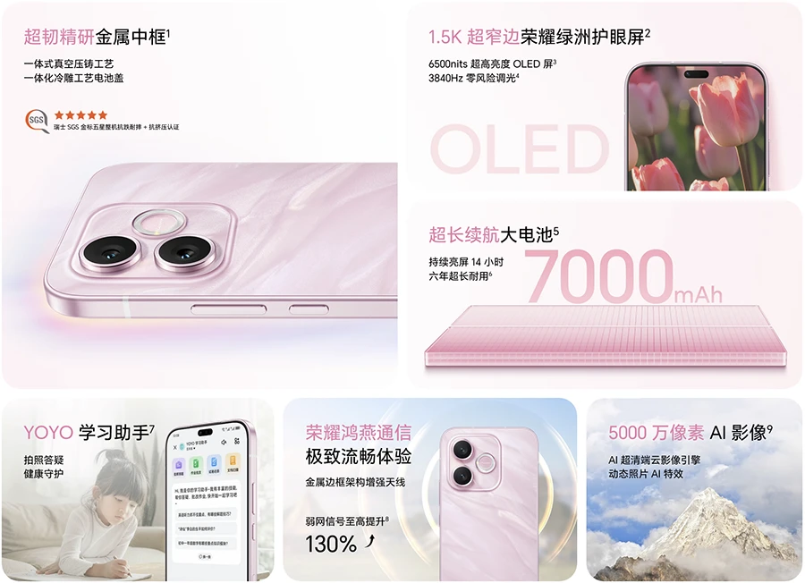 在核心配置上,荣耀X80i搭载了天玑6500 Elite处理器,性能表现出色,能够轻松应对日常使用和游戏娱乐等场景。内置7000mAh大容量电池,官方宣称具备6年耐用长寿命,支持45W快充技术,让用户告别电量焦虑,随时保持满电状态。