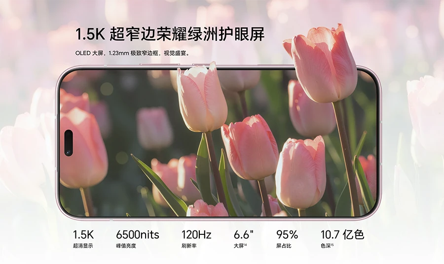 屏幕方面,荣耀X80i配备了一块6.6英寸的1.5K超窄边荣耀绿洲护眼OLED屏,峰值亮度高达6500nits,即使在强光下也能清晰显示。该屏幕支持120Hz高刷新率,带来流畅的视觉体验,同时采用3840Hz零风险调光护眼技术,有效减少长时间使用对眼睛的伤害,保护用户视力健康。