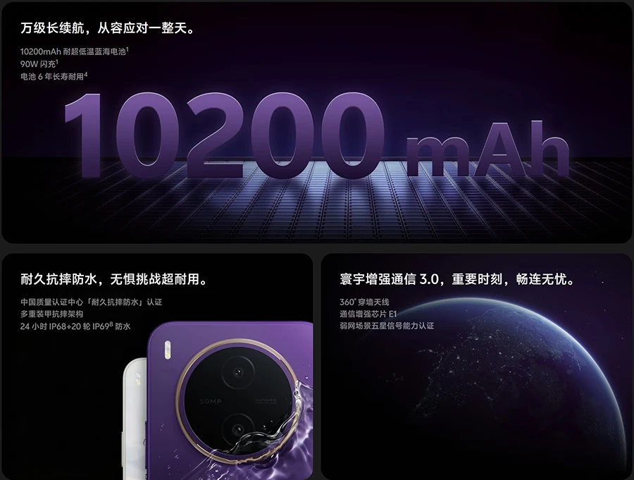 vivo Y600 Pro最大的亮点莫过于其全球首发的10200mAh耐低温蓝海电池。这块电池不仅容量惊人,能量密度更是高达886Wh/L,刷新了蓝厂手机电池的历史记录,为手机提供了超长续航的核心保障。配合高效能的AI省电芯和联发科深度调校的电源管理系统,vivo Y600 Pro在全链路供电上实现了精准管控,传输损耗降低了百分之二十,进一步延长了电池使用时间。此外,低电救星升压芯片的加入,使得手机在电量告急时仍能保持稳定电压输出,确保用户无忧使用。