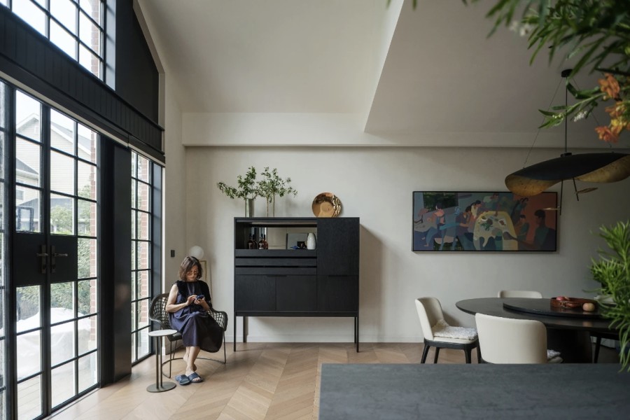 业主为一对青年精英夫妇,儿女双全,三代同堂,有较高的社交需求。原建筑为300多平方米的木结构两层美式小别墅,每层的层高偏低,改造后成为能从容满足三代人居住并拥有各功能空间的高品质住宅。层高经改造升高后的一楼布置了非常宽敞的客厅和餐厅,餐厅由原车库改建,并开放出原来被封闭的屋顶空间,增加高部的窗面积,使得餐厅得到更多的光照。