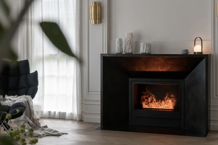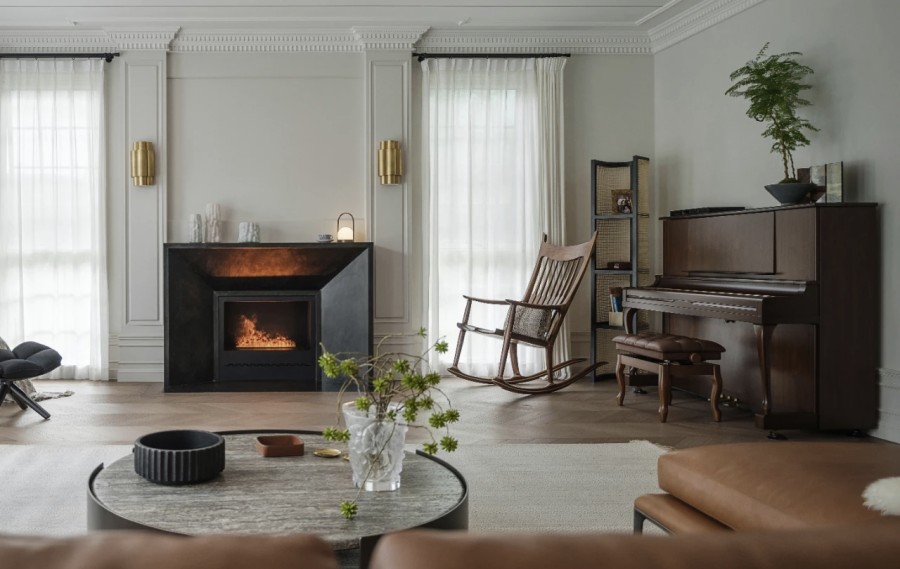 进入客厅瞬间,自然便不再是窗外的风景,而是“住进”了空间里:花树自角落探向天光,枝桠舒展间,把岁月的青雾与花期,悄悄牵进客厅 ,当随微风轻晃,像在与沙发上的居者轻声对话。壁炉跳跃的火花与复古钢琴相映,自然生机与艺术感交融。人物、钢琴、绿植与百叶窗滤入的光影共同营造“一人、一琴、一世界”的交融感。