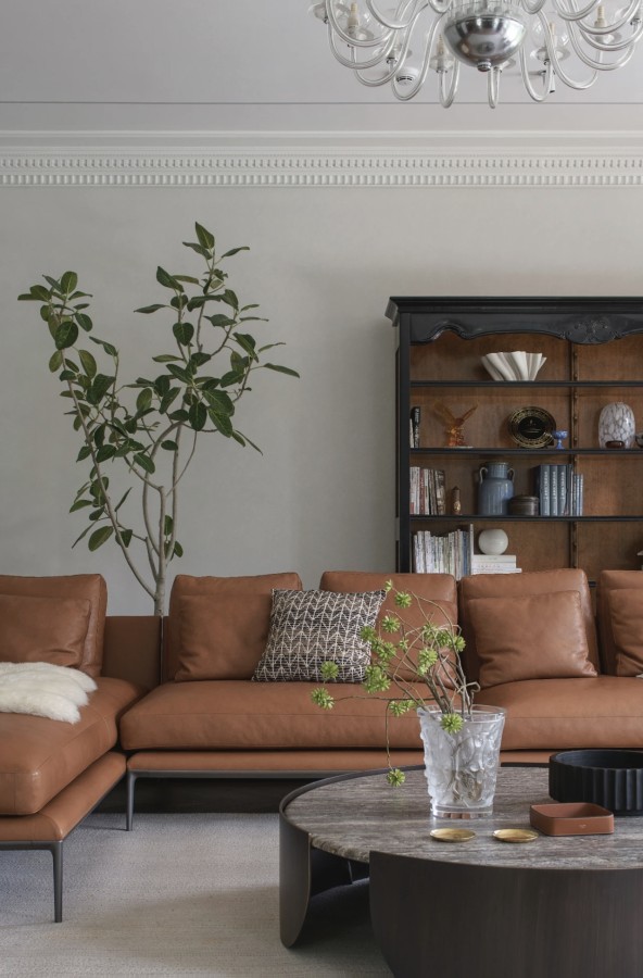 客厅B&B的主沙发和单人沙发,一对Poltronafrau的奶牛皮沙发椅和Cantori金属与石材结合的茶几,配上Vittoria Grifoni的意大利古典高柜,与客厅一隅的老式钢琴相互凝望。家不只是一个遮风挡雨的栖身之所,更藏着一种独特的生活状态,是装满情感、沉淀故事的容器。它能与居住者进行无声的对话,让生活的模样在其中自然生长。这空间里的每一寸肌理,都渴望成为居住者的心安之地,把生活的种种可能,都温柔地捧在这方宅第。