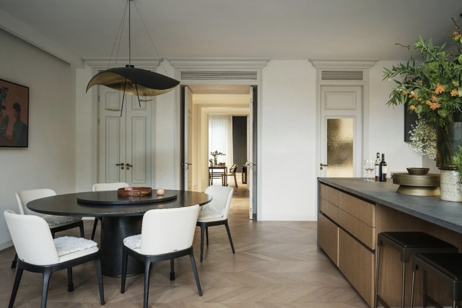 厨房与餐厅连成了无界相融的空间,家人或在厨房打理食材,或在餐桌旁搭手帮忙、闲话家常,亲情在这样的互动里慢慢聚拢,生活的烟火气也悄悄漫溢了整个屋子。静待老友的日常氛围,仿佛盛夏午后,窗外蝉声,屋内书页翻动,生活本身的样子就是最自然的布置。