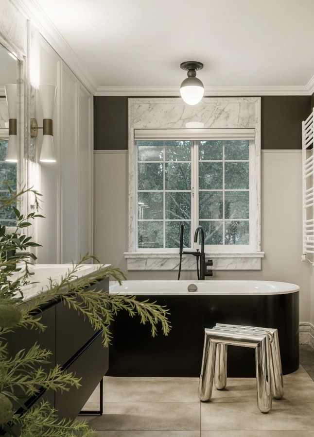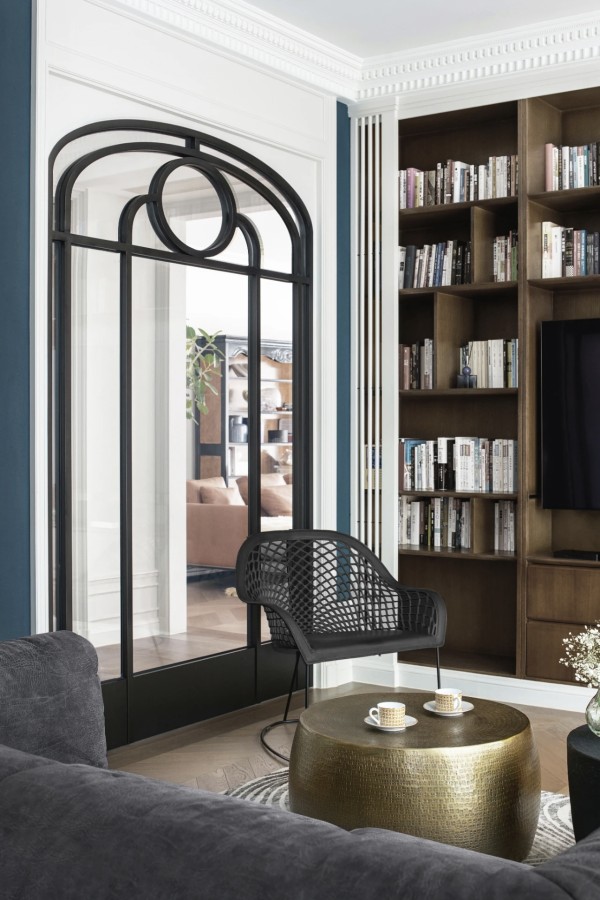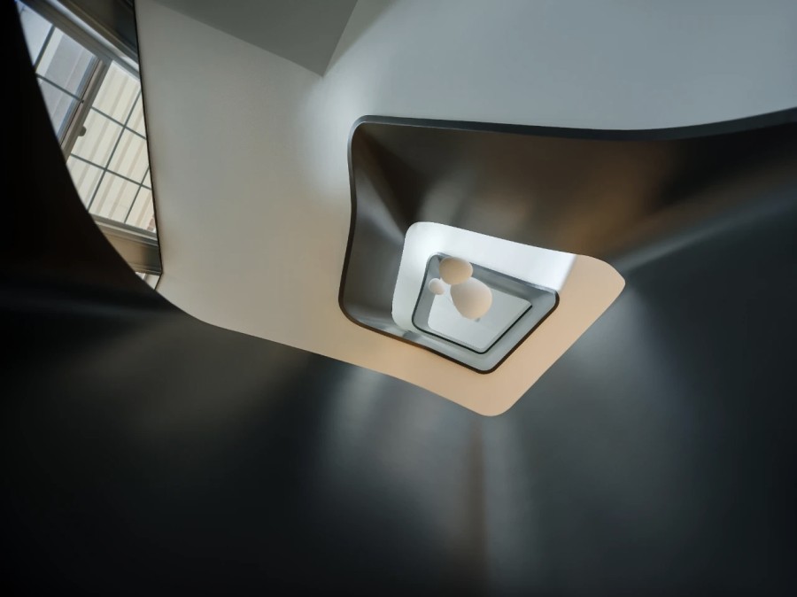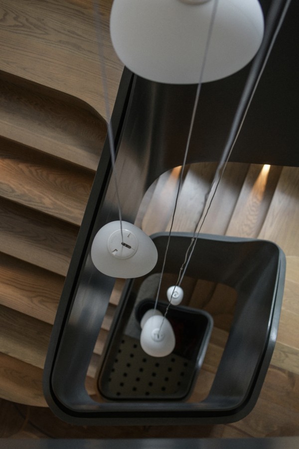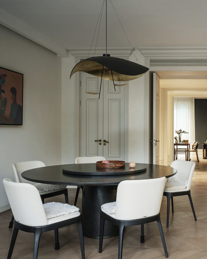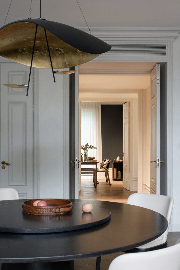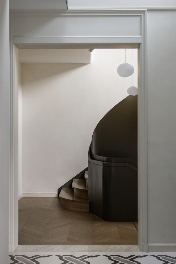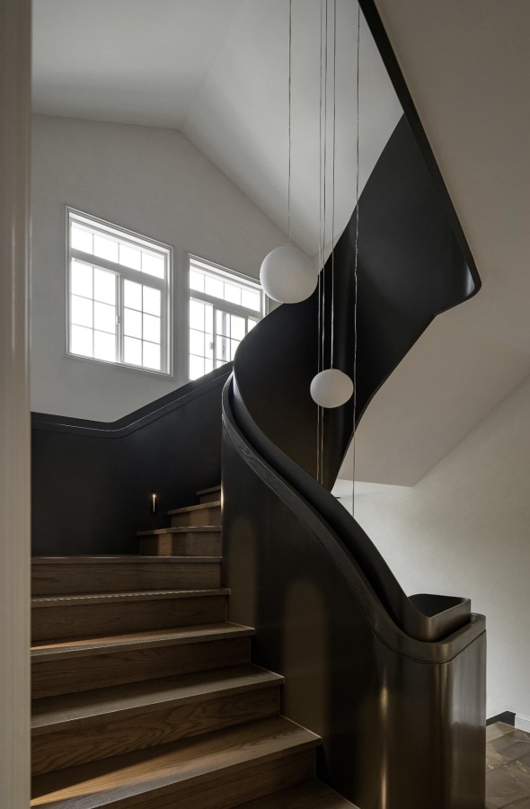 一条宽阔的长廊连接了通往各空间的动线,客厅,茶室,餐厅,楼梯间,厨房及保姆房分立两侧。门厅一侧的书房保留了原有的高度,有单独的楼梯通往下方的酒窖。每一处转角都藏着新的惊喜,起承转合,点缀白色的圆球灯饰,从下自上仰望,如绽放的黑色玫瑰中点点花蕊,弥漫着悠然秘境的氛围。设计师凭借其独特的精妙的设计,让这里散发着令人心醉的魔力。