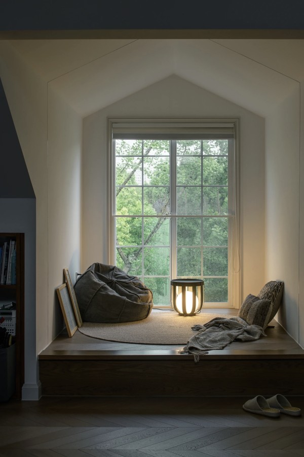 二楼为四间卧室,将原来的屋顶空间改造为阁楼,增加天窗采光,除了宽大的活动室外,还开辟出卫生间及充足的贮藏空间,阁楼加建的落地窗是孩子们爱去的角落。