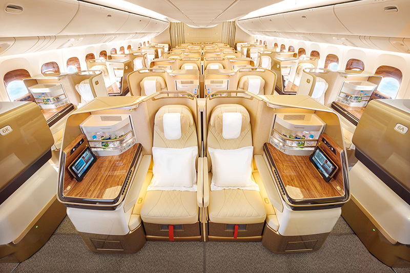 阿联酋航空波音777商务舱亦经过全新设计,座椅采用1-2-1布局,兼顾私密性、直通过道的便利性以及充裕的工作、休闲与休息空间。每个座椅均采用香槟色皮革包裹,与最新款阿联酋航空A380上的座椅材质一致,并配有精致的缝线和柔软的缓冲头枕。