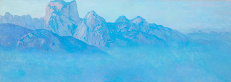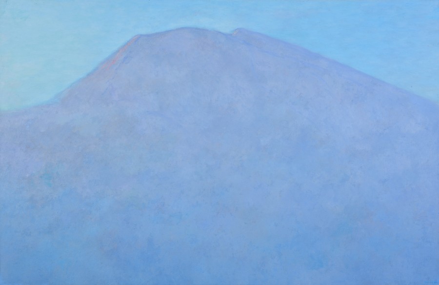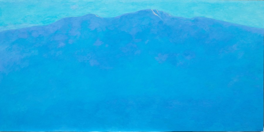 “元境”系列也可以说是“蓝调”系列。蓝色是自然给予人类最为平和、安静的色系,中国制作蓝印花布的工序中依据自然,可以因不同节气而将蓝色进行分类,不同节气对应不同的蓝色系。田学森“元境”系列作品笼罩在蓝调之中,巍峨而崇高的山形隐含在其中,他没有突出圣山的具体细节,只让山影绰约,远观则混沌一片,田学森已经跳出拘泥于形的描绘阶段,他彷佛在表现一种山的蓝调梦境,沉静而又神秘。