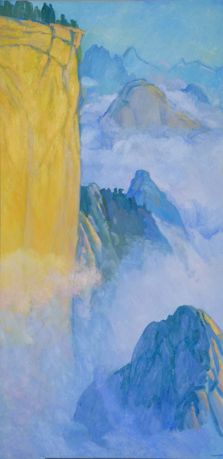 田学森属于苦修派,他不会放弃画中的每一个局部,必定用笔触一笔一笔去堆画山的意象。因而“元境”系列的精彩之处是在于色调之下的细节,需得细观才见,在有与无、隐与显之间,意象丰富而又深沉。“元境”系列中还出现了几张表现阳光照耀下的金顶圣山,他突出了蓝调与金色极大的色差对比,而使阳光下金顶更加雄壮与神圣。田学森的“元境”系列在朦胧诗意的表现中,营造的是一种“道”境,“惚兮恍兮,其中有象,恍兮惚兮,其中有物”。学森的生命精神完全融化于画面之中,他的“元境”系列如同一首交响乐,时而婉约低沉,时而平静如水,时而却高歌猛进。将观者带入了神秘、虚幻而又庄严的圣境之中。