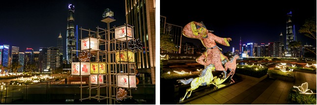 豫园灯会的设计语言从凝晖路漫延至枫泾路,祥云与新春礼盒化作时尚符号,在BFC的潮流空间中重构焕新,令“踏梦寻光”灯组在摩登场域中绽放出别样的光影魅力。BFC五楼江景露台上,「从十万马力到七十二变」展览中的灯组“骉骉入梦”与外滩的璀璨江景交相辉映。展览由艺术家黄小眠和上影元文化联合主办,展览中的作品「走马灯·七十二变镜界」以《大闹天宫》孙悟空为灵感,通过镜面与走马灯共舞演绎无穷变幻,展现了经典神话在现代艺术家创新重塑下的独特形象;「弼马温·天马越星河」则将神话绘入夜空,仿佛引领观者挣脱引力,奔赴星海。这两件灯组将延展至马年尾声。