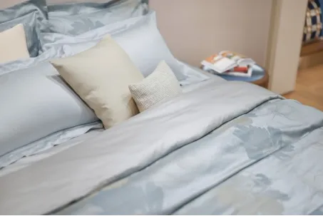 卧室是整个门店体验的重中之重。床品以完整铺陈呈现其在真实使用场景中的状态——面料的垂坠感、纱支的细腻度、织纹在光线下的细微变化,以及肌肤与织物接触时的柔软回馈,被一一放大。织物不再只是简单地被观看,而是在触碰中被理解、被感受。